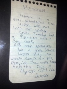 This was written after my grandfather had passed away and I wanted to make my Dad be not so sad. I found this paper in my fathers things when we were moving my mother to an independent living apartment. He had kept it all those years, which makes me think that my purpose for writing it was successful. And that makes me not so sad. Sometimes it truly is the little things we do that make the biggest impressions.